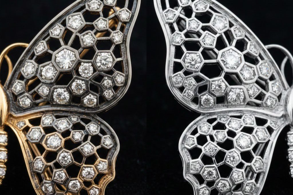 現代珠寶多使用鉑金或白金,但在 19 世紀,為了追求鑽石火彩的純淨,頂級工匠發展出「銀鑲金」技法。這種工藝在胸針正面使用銀(Silver)鑲嵌鑽石,避免黃金的色澤干擾鑽石的淨白;而在背面則焊接上一層薄金(Gold),以防止銀氧化沾汙皇室昂貴的絲織衣物。
